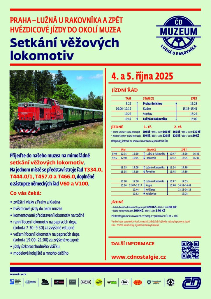 O víkendu 4. a 5. října se v ČD muzeu v Lužné u Rakovníka uskuteční premiérové setkání věžových lokomotiv. Těšit se můžete na známé lokomotivy z tuzemských sbírek i na unikátní lokomotivy ze Slovenska nebo Německa. Po oba dny pojede do Lužné zvláštní vlak z Prahy a také se uskuteční zvláštní jízdy z Lužné do Řevničova, Rakovníka a Kolešovic.